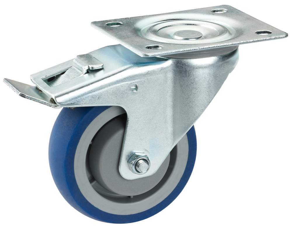 Transportgeräterollen mit Stahlfelge und Vollgummireifen, Lenkrollen mit Platte und Totalfeststeller, Rad-Ø 80 mm, Bauhöhe 107 mm, Tragkraft 50 kg