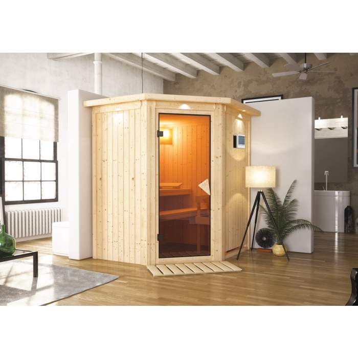 - Wandelemente;Saunadach;Saunatür;1 Ofenschutz;2 Liegen;1 Kopfstütze;Schrauben und Beschläge