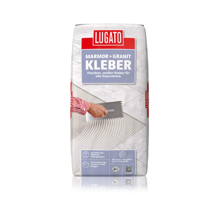 Weisser Natursteinkleber mit schneller Wasserbindung. Hochklebkräftig, mittelflexibel, schnell. Nach 3 Stunden begehbar. Wasser- und frostbeständig. Lässt keinerlei Verfärbungen zu und kein Durchscheinen des Klebstoffes. Auch auf Heizestrichen geeignet.
