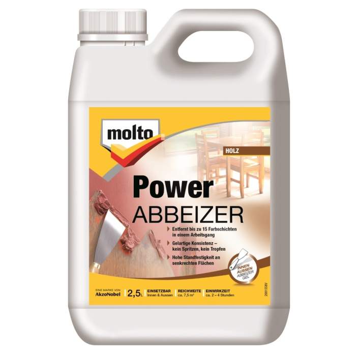 Entfernt bis zu 15 Farbschichten in einem Arbeitsgang. Gelartige Konsistenz - kein Spritzen, kein Tropfen. Hohe Standfestigkeit an senkrechten Flächen. Kraftvolles Abbeizer Gel, das für fast alle Untergründe im Innen- und Aussenbereich geeignet ist. Zum Entfernen von alten Anstrichen wie z.B. Kunstharzlacken, Lasuren, Dispersions- und Latexfarben, Acryllacken und –farben. Zum Entfernen von Öllacken empfehlen wir die Verwendung von Molto Moltostrip Abbeizer. Verarbeitung: Angrenzende Flächen gut abkleben und abdecken. Molto Power Abbeizer sollte zur Sicherheit an einer unauffälligen Stelle getestet werden. Molto Power Abbeizer gut umrühren und mit einem weichen Pinsel satt und gleichmässig auftragen. Tipp: An senkrechten Flächen von unten nach oben arbeiten. Nach einer Einwirkzeit von bis zu 4 Stunden die angelöste und aufgekräuselte Schicht mit einem Spachtel vollständig entfernen. Eventuelle Reste mit einer Bürste entfernen. Bei extrem vielen Schichten den Vorgang wiederholen oder die behandelte Stelle über Nacht in eine Plastikfolie wickeln. Die abgebeizte Fläche gründlich mit Wasser, Bürste und Schwamm abwaschen. Anschliessend nochmals mit Wasser abwaschen. Nach dem Trocknen kann die Fläche geschliffen werden. Inhaltsstoffe: Ester, Methylsulfoxid, Keton, Additive. Reichweite: ca. 1,5 m2